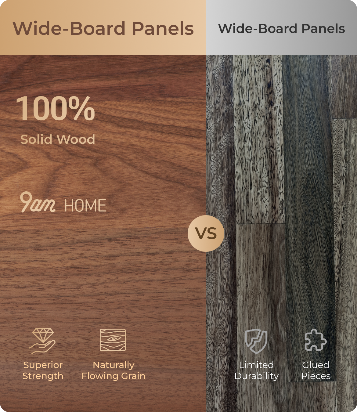 At 9am Home, we insist on using FAS-grade solid timber, crafted from full-length boards with clean joins. This ensures smoother grain, minimal colour variation, and a 100% authentic wood texture—natural beauty you can see and touch.