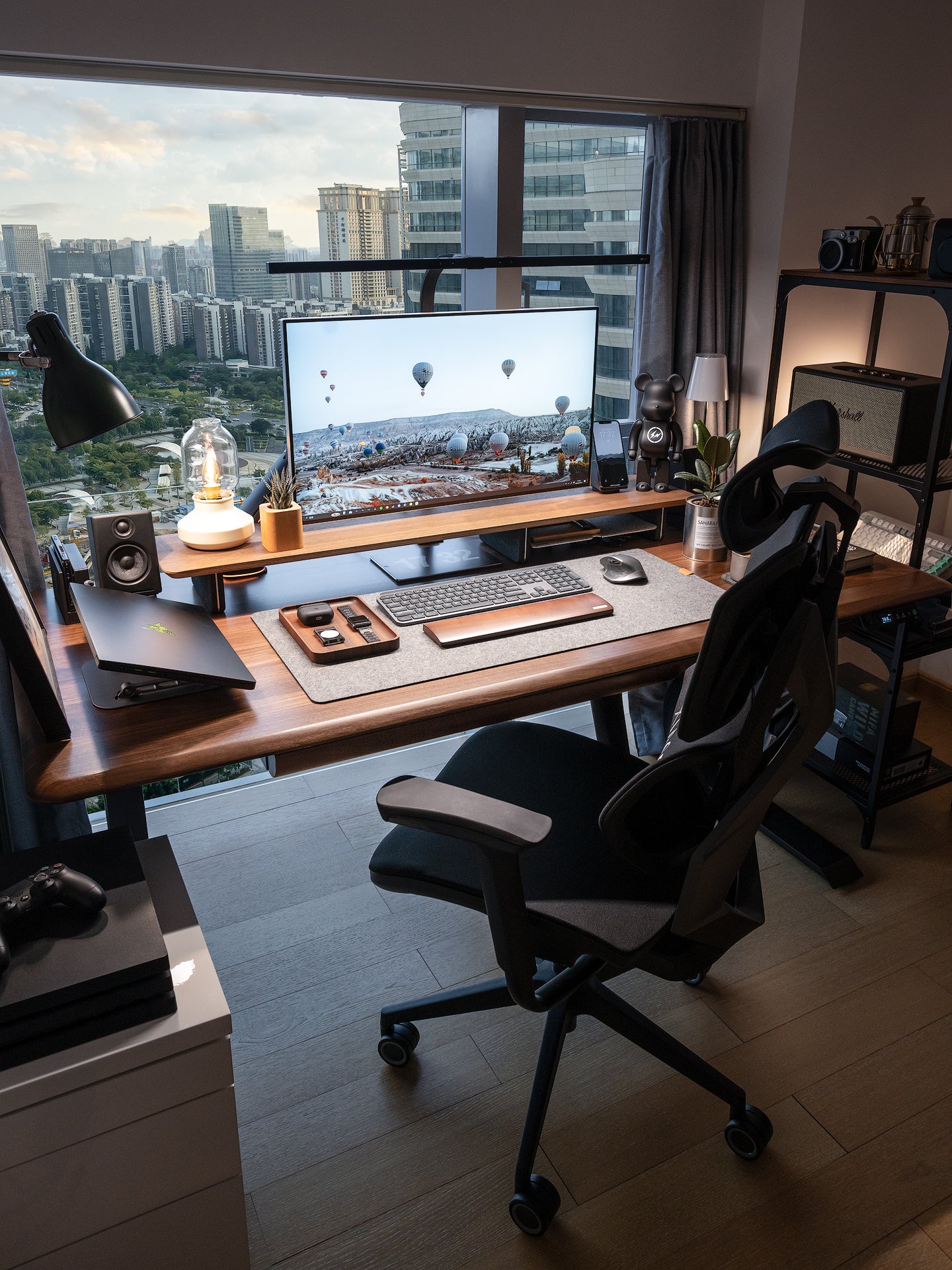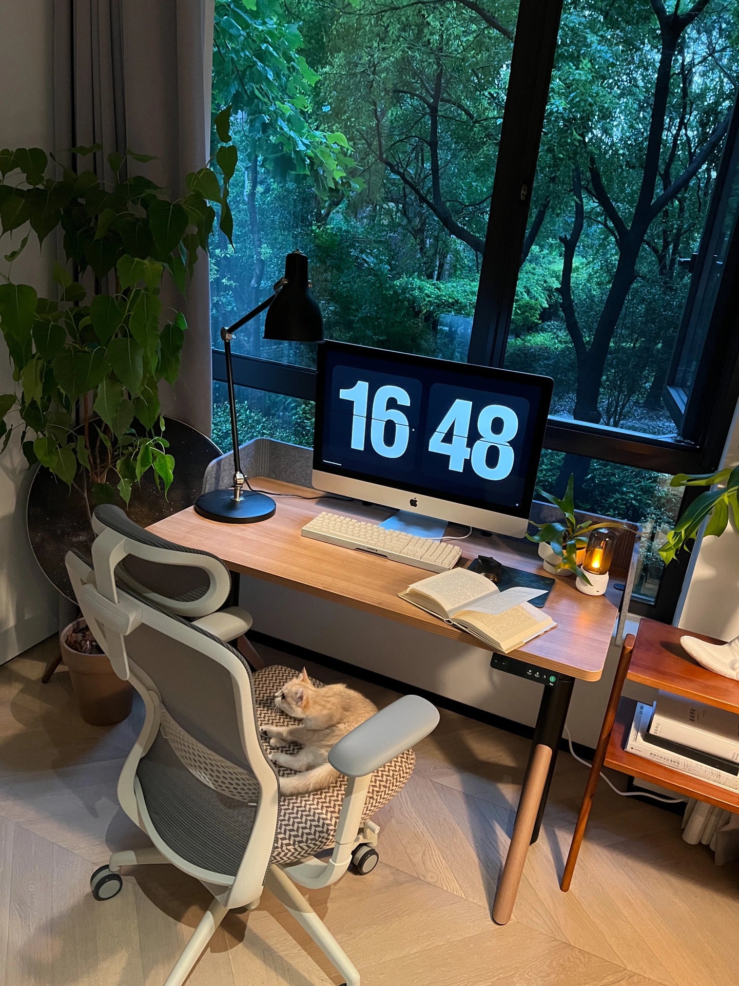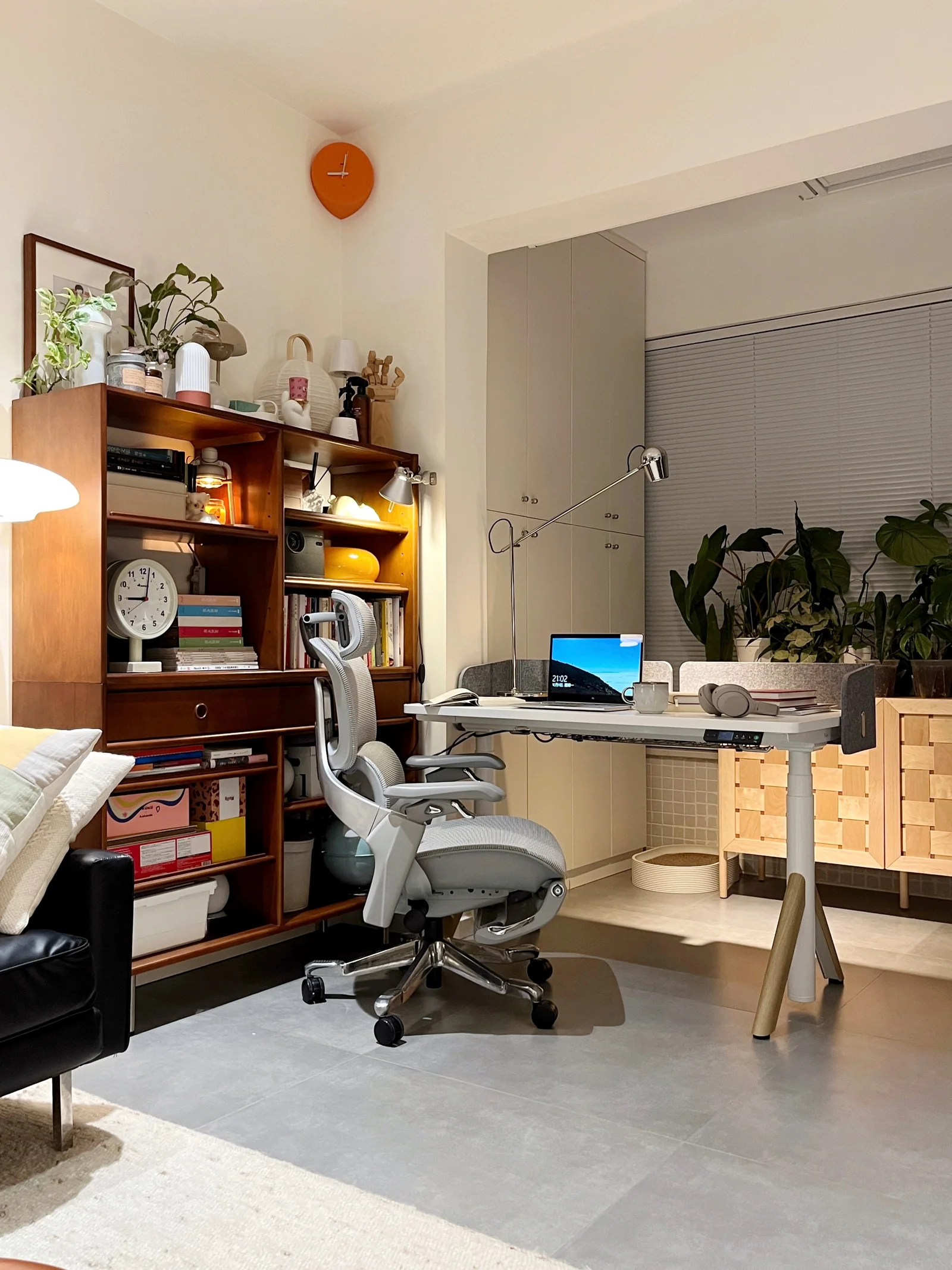 A cozy home office is created by its warm wooden tones and soft lighting. The adjustable standing desk pairs with an ergonomic chair for a perfect balance of concentration and comfort. A book shelf can bring personalization and order while increasing storage space.