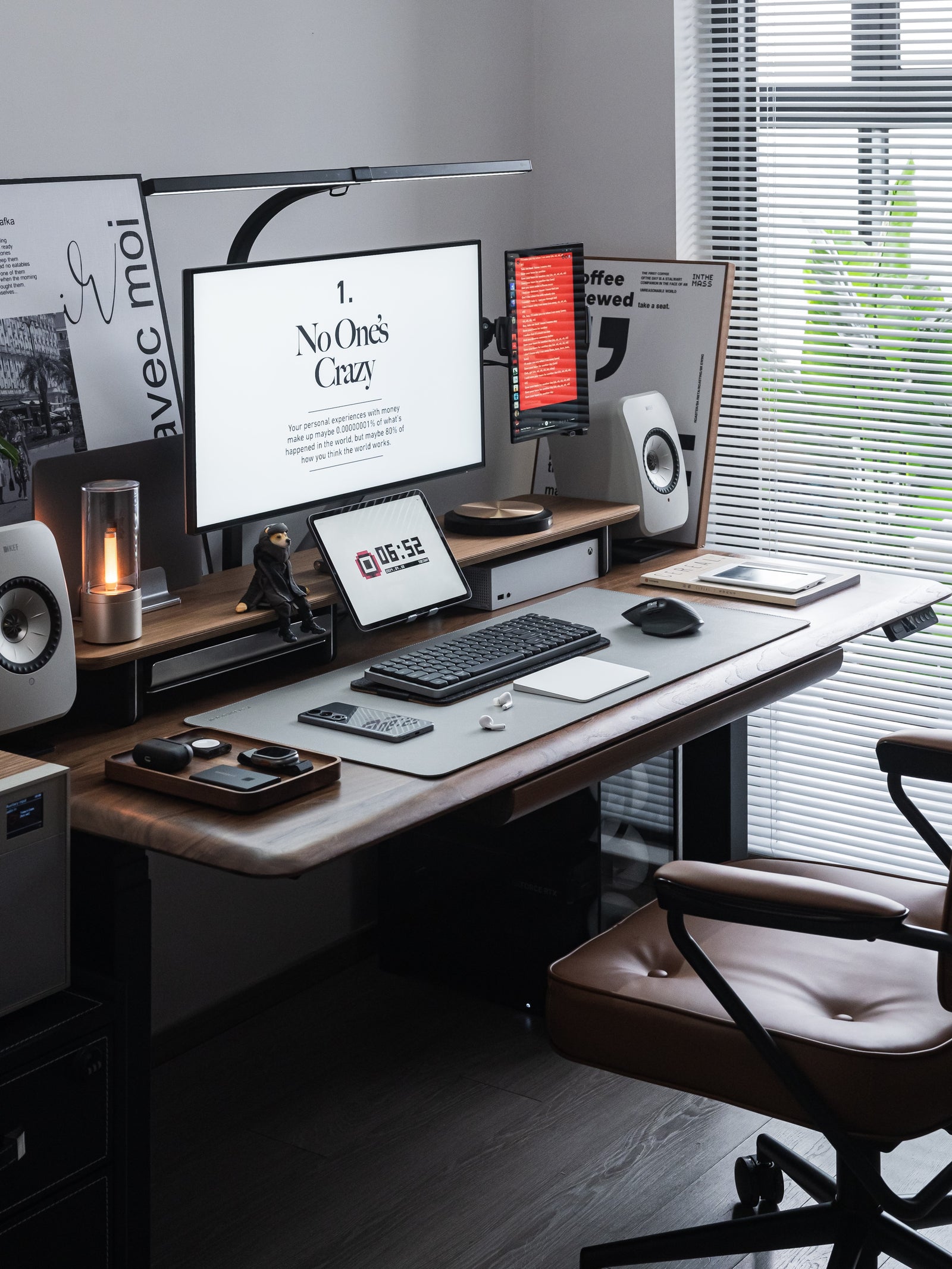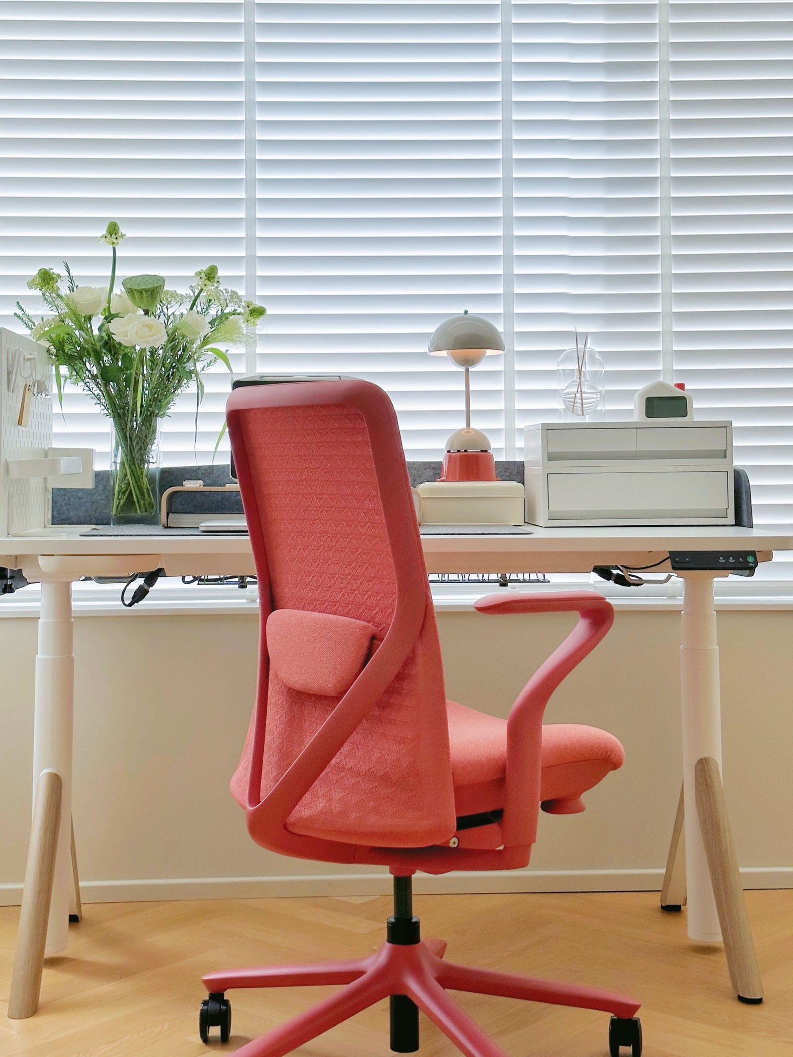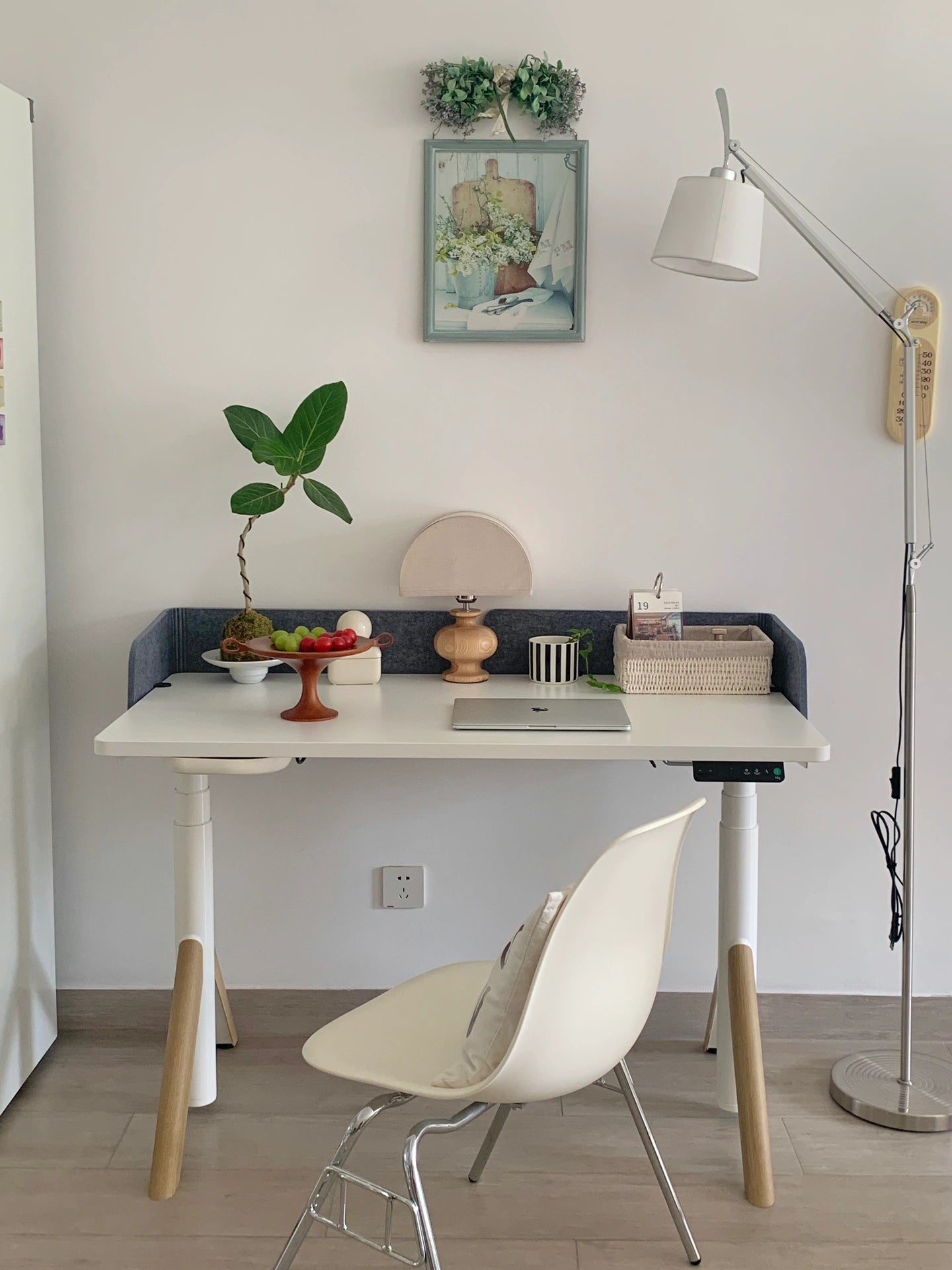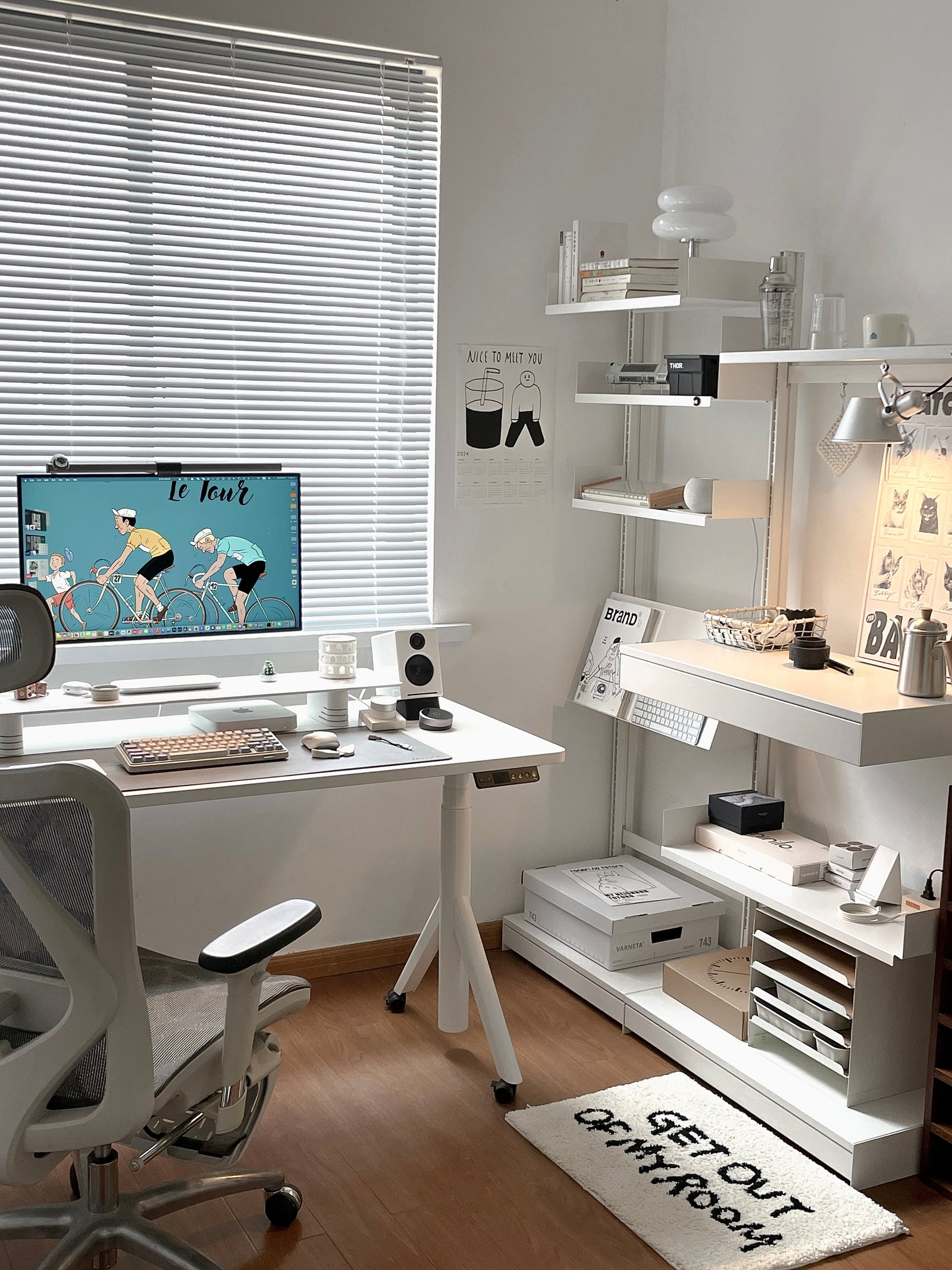 The consistent white color scheme throughout the accessories ties the space together visually, while the standing desk with casters provides functionality and flexibility. This combination makes your home office space highly adaptable and versatile.