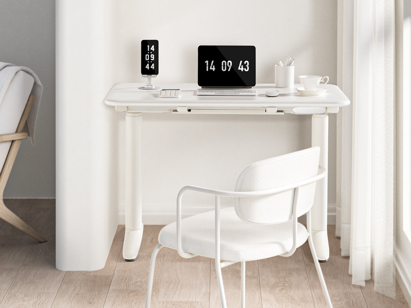 The Atom Home Office Mini features a snow-white matte powder-coated surface—soft to the touch and glare-resistant. It includes a sleek touchscreen controller for intuitive operation. At just 1.1 m in width, it’s ideal for compact spaces, perfect for students, home workers, and creators. Pair it with a monitor arm, riser, and clamp power strip to maintain a clean, ergonomic setup.