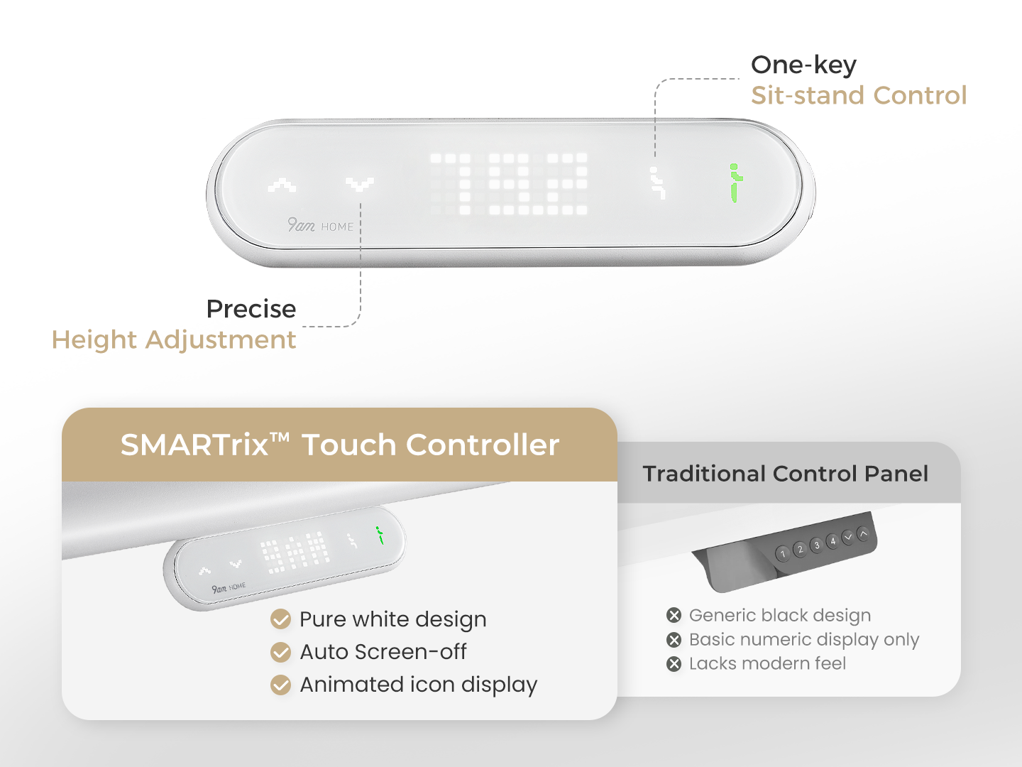 The all-white touch controller features a playful animated interface that makes every interaction feel engaging and intuitive. A standout green icon gently reminds you to switch between sitting and standing. Thoughtfully designed to match the desk’s clean, minimalist aesthetic.