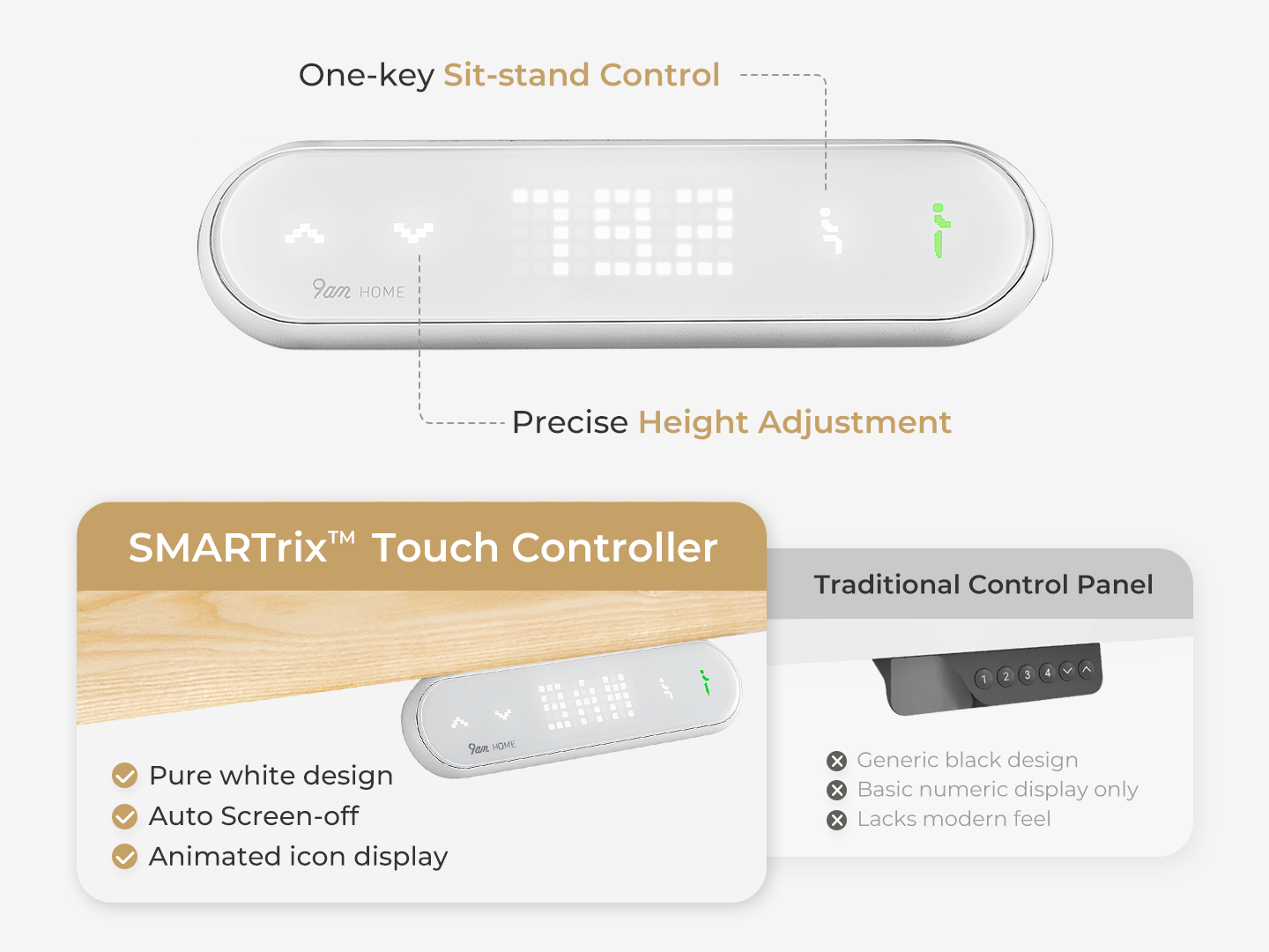 The all-white touch controller features a playful animated interface that brings a fresh experience every time you use it. Its dynamic animations create an interactive experience that feels engaging and supportive every time you adjust your desk. Designed to blend perfectly with the desk’s clean and minimalist style.