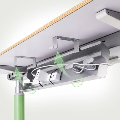 A hidden flip-down compartment below neatly tucks away cables and power boards, keeping your workspace clean and wire-free.