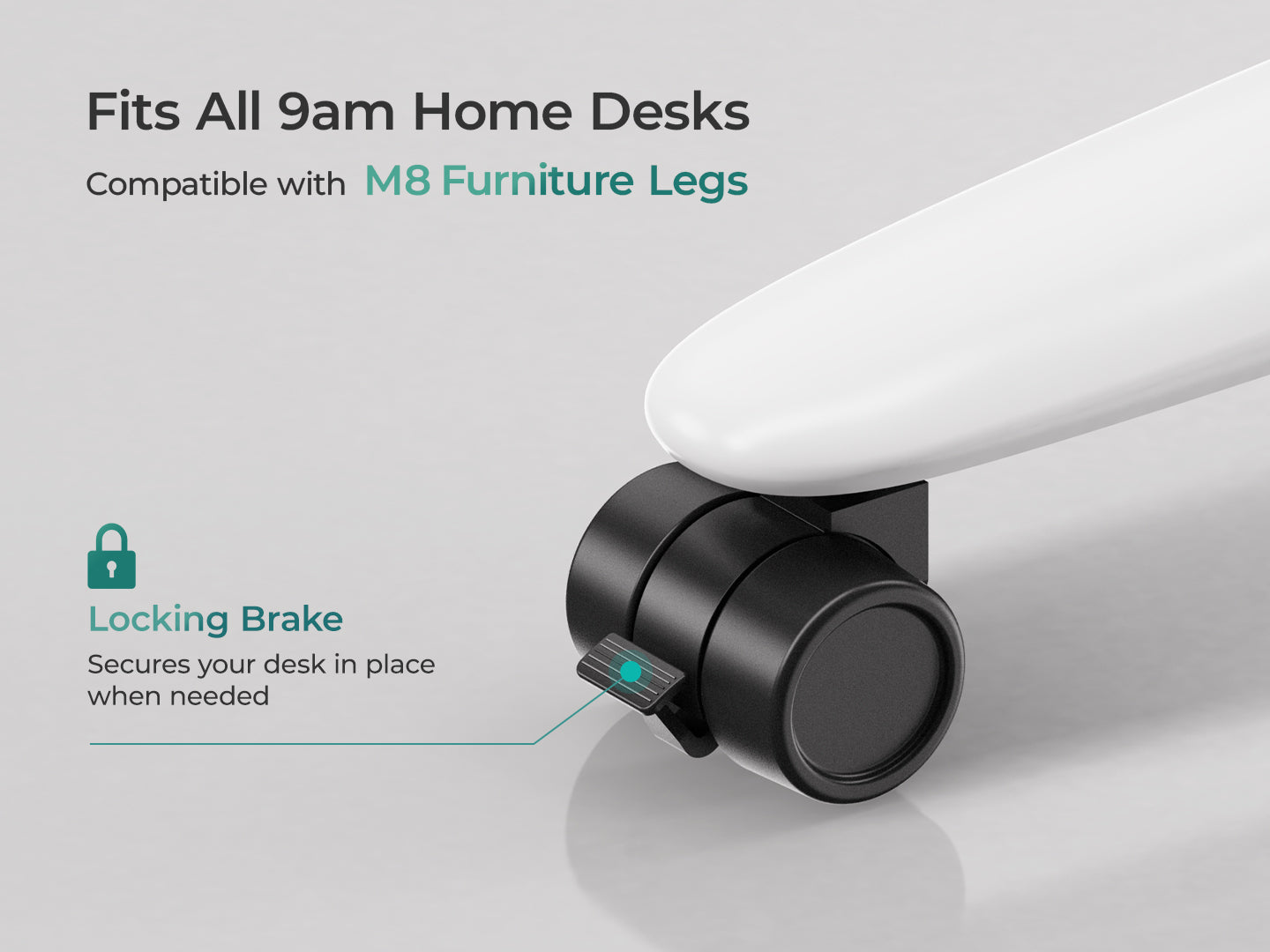 Equipped with a reliable brake system, the casters lock securely in place whenever needed. Designed for versatility, they are compatible with all 9am standing desks and any furniture with M8 threaded legs.