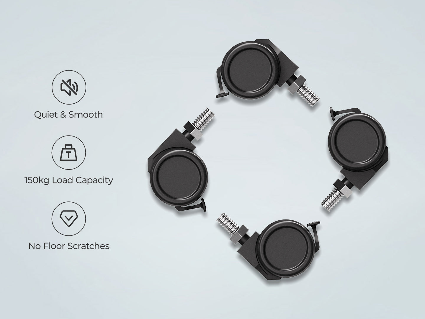 Soft-edge casters glide smoothly across wood and tile floors without leaving scratches. The low-gravity design provides extra stability and supports up to 150 kg (set of 4), while quiet rolling ensures every move feels effortless and distraction-free.