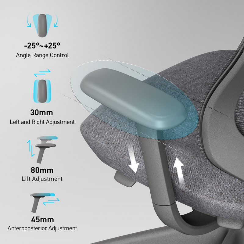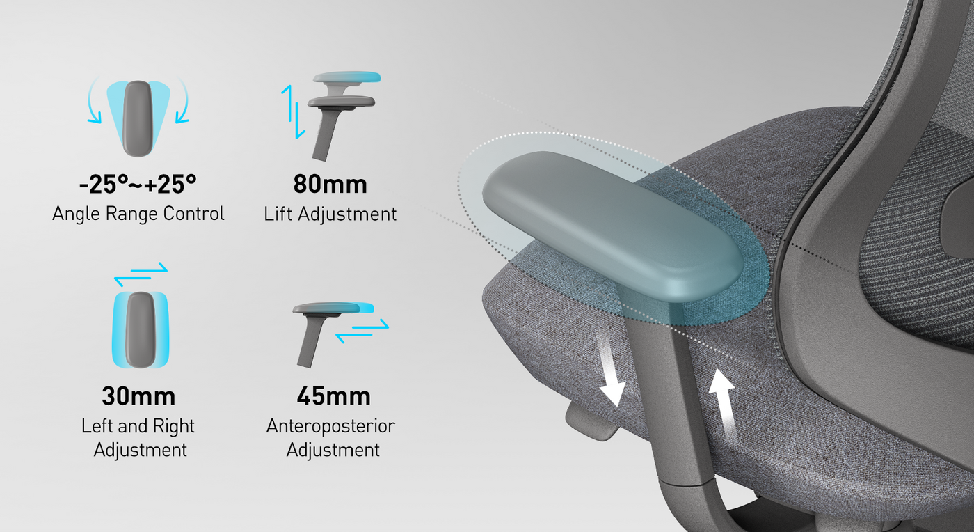 Armrests reduce shoulder and neck tension. 4D armrests move up/down, forward/backward, sideways, and rotate, allowing a more personalised ergonomic setup.