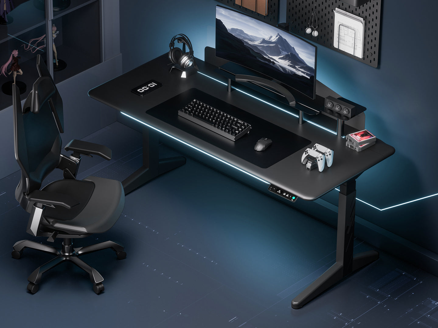 The Raven modular dual-motor gaming sit-stand desk features a matte powder-coated surface that’s soft to touch and glare-resistant. Designed for multi-device gamers and power users, it offers high load capacity, ergonomic 3D-curved edges, and integrated cable management. Pair it with a monitor arm, dual-tier riser, and clamp power strip to create a high-performance, organized workspace.