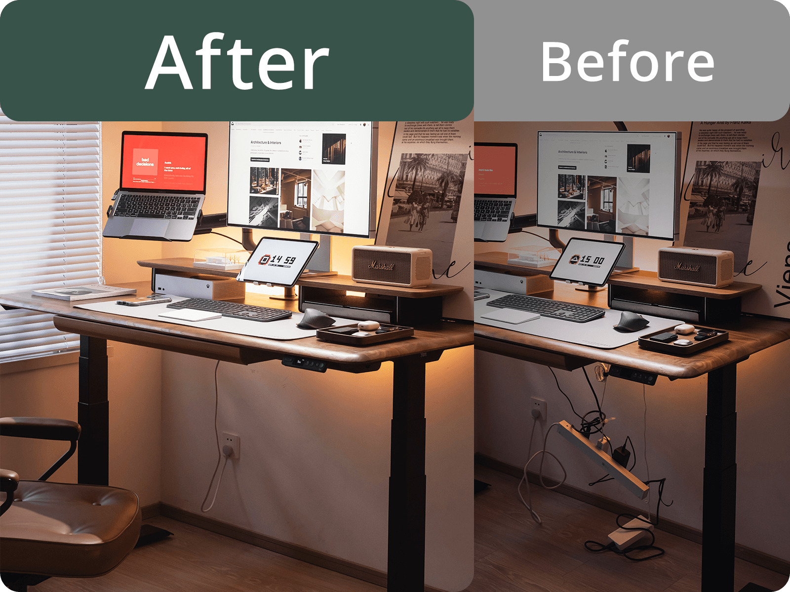 After - Our cable management neatly hides cables and reduces clutter, giving you a clean, streamlined workspace. It not only creates a minimalistic aesthetic but also improves the efficiency of finishing cables by allowing easy access to all your cables without the usual mess.